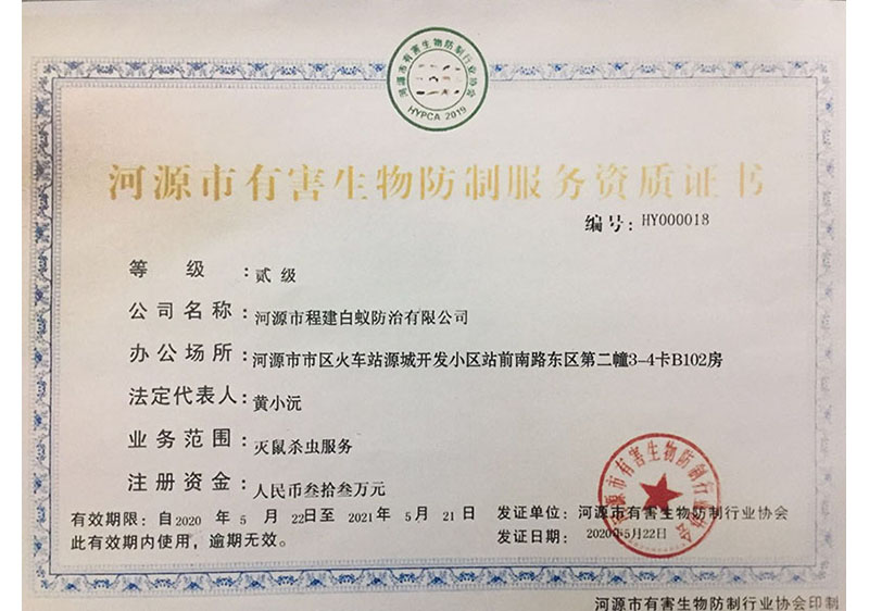 河源市有害生物承承防制服務資質證書